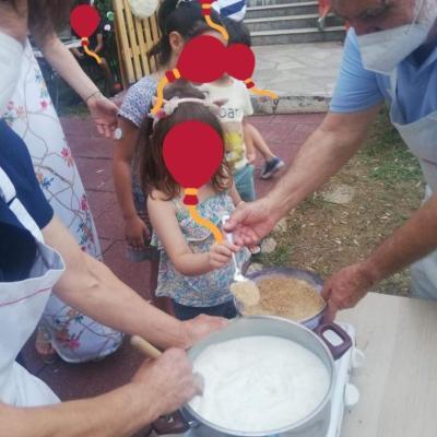 Στο επόμενο στάδιο κόβουμε πλιγούρι στον χειρόμυλο και κατασκευάζουμε τον παραδοσιακό τραχανά. Όλα τα ζυμαρικά απλώνονται για να στεγνώσουν. Η δραστηριότητα τελειώνει με τα παιδιά να φεύγουν παίρνοντας μαζί τους σε ένα σακουλάκι τα ζυμαρικά και σε ένα ποτηράκι τον τραχανά τους.